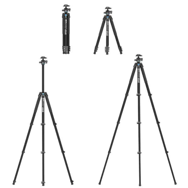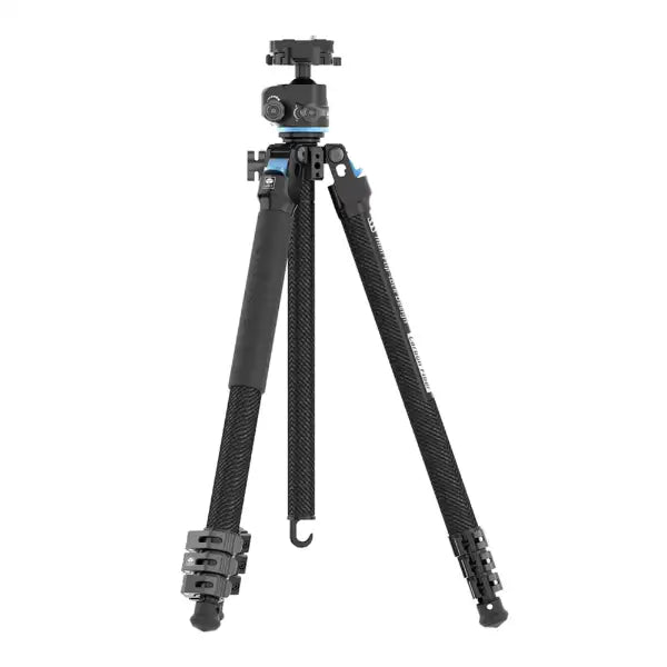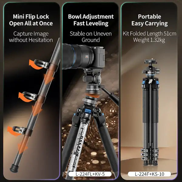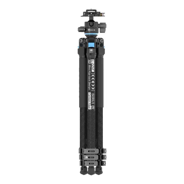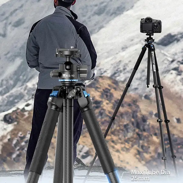 素材に3kカーボンファイバーを採用し強度を向上させた、最大管径25mmのフリップロック式4段三脚とフリップロック式低重心ボール雲台(KS-10)のセット。