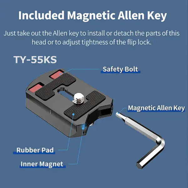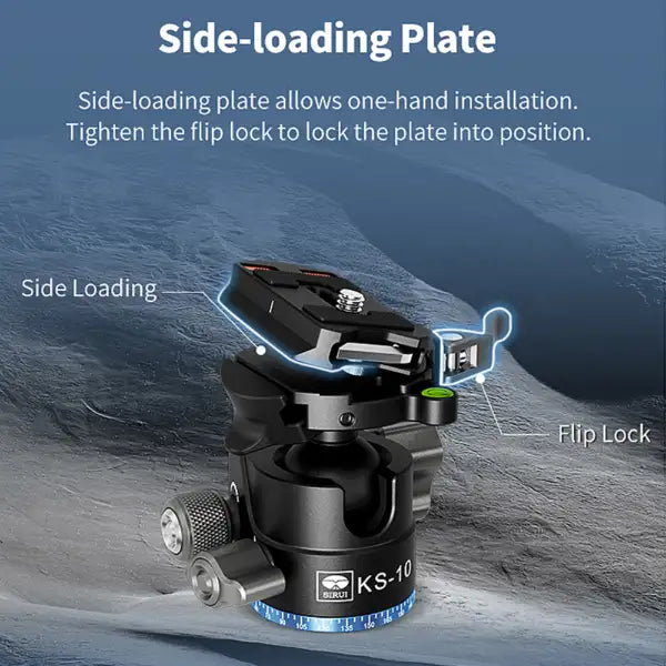 フリップロック式の低重心ボール雲台KS-10-JPをセット。フリクション調整ノブ付きで、耐荷重最大15kgの設計。付属クイックシューのTY-55KSには六角レンチを内臓。