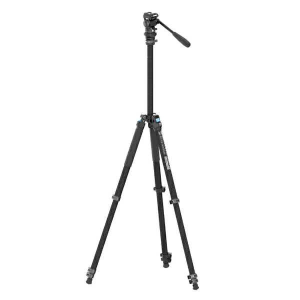 素材に3kカーボンファイバーを採用し強度を向上させた、最大管径25mmのフリップロック式4段三脚とビデオ雲台のセット。レベリングベース機能付き。